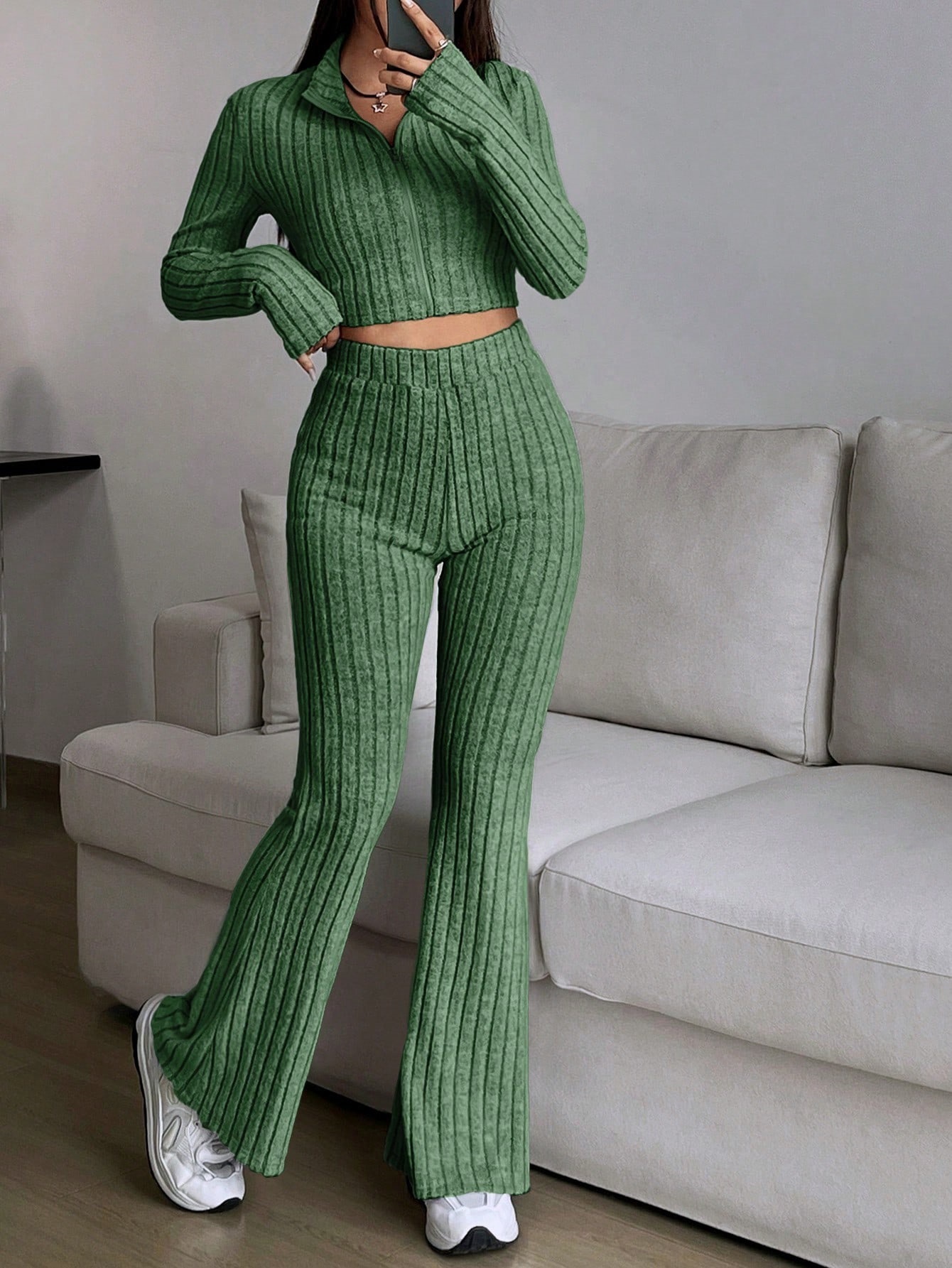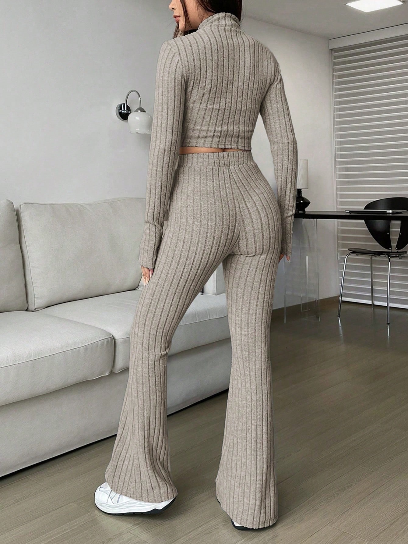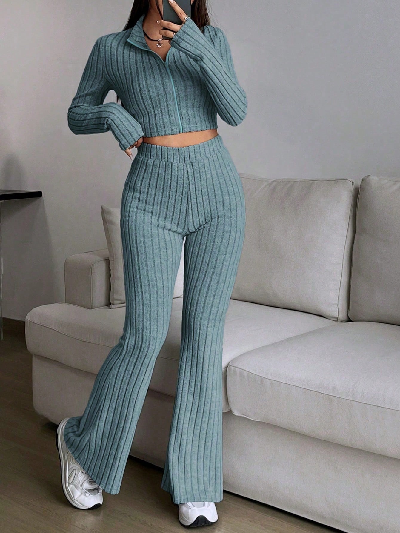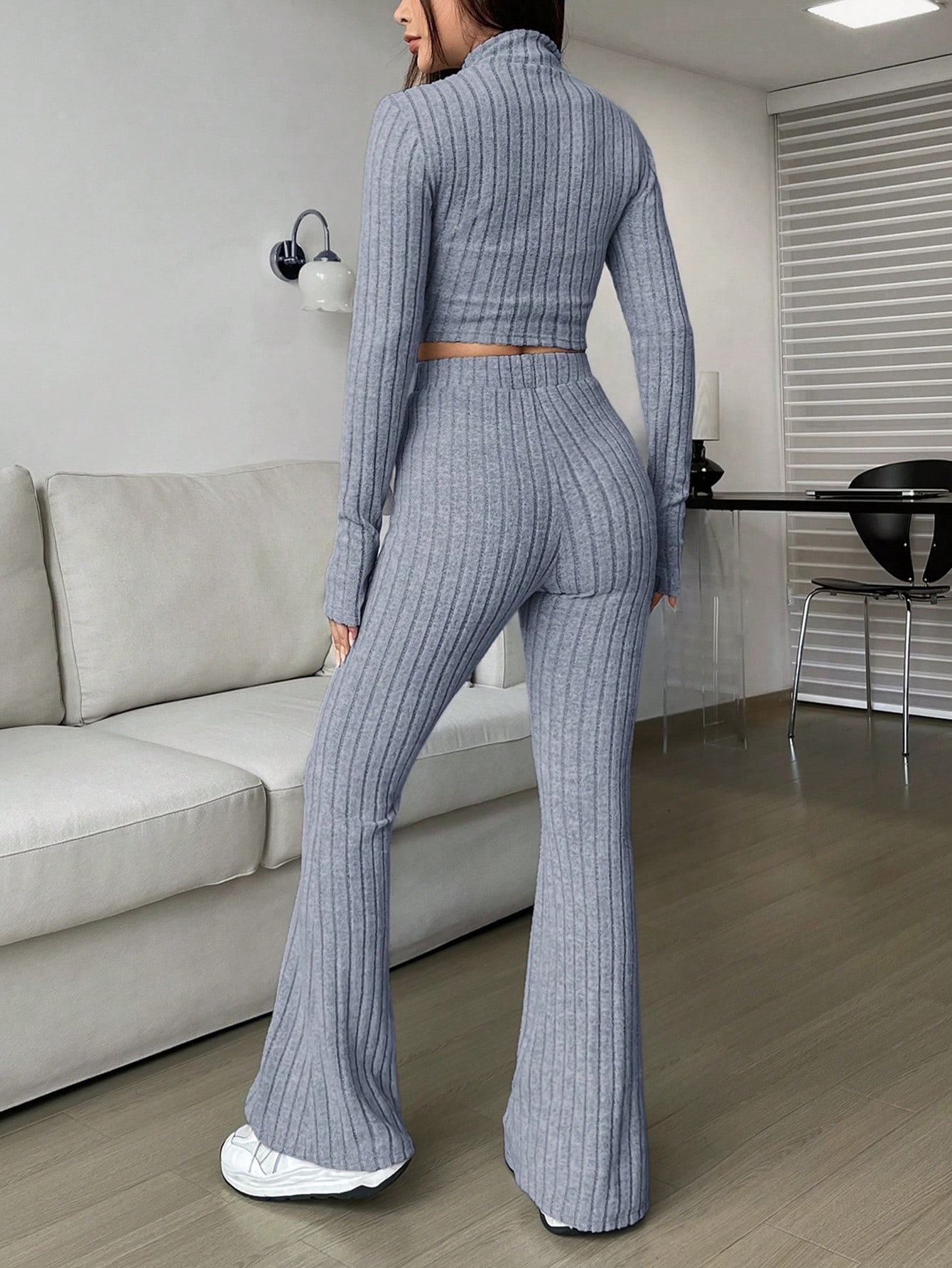 Fashion Solid Ribbed Two-Piece Set, Zip-Up Long Sleeve Cropped Top and High-Waisted Flared Pants Set, Women's Casual