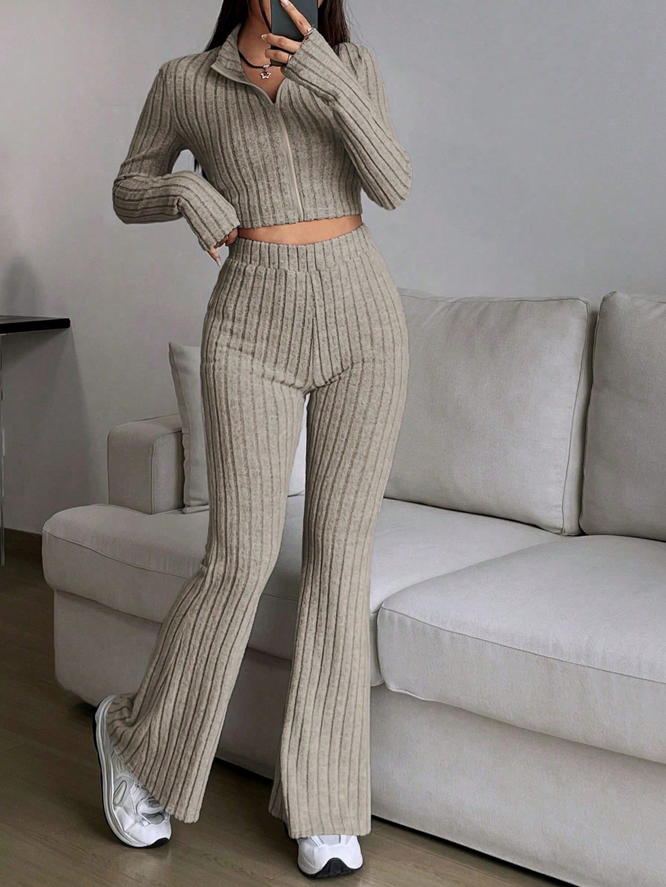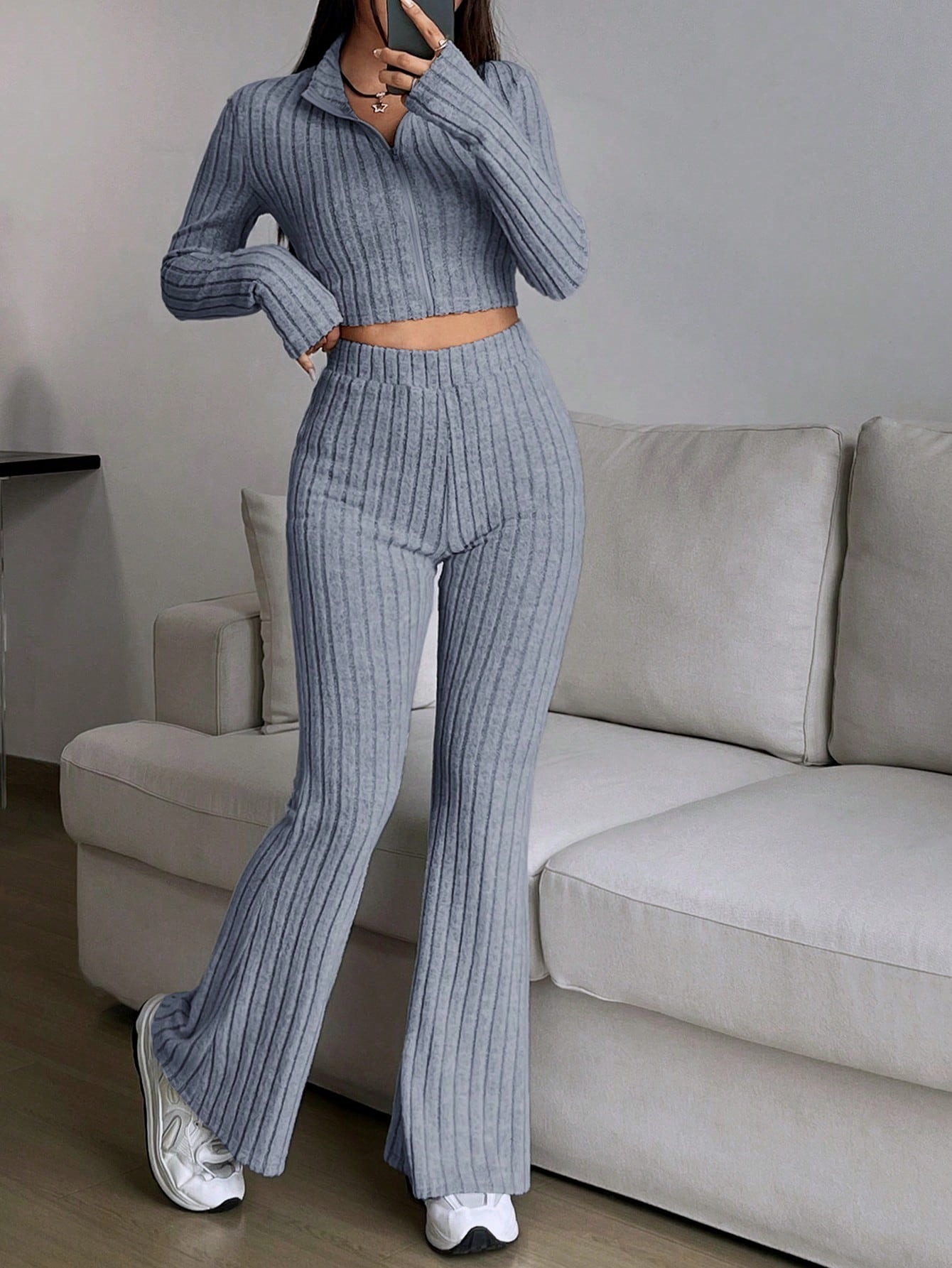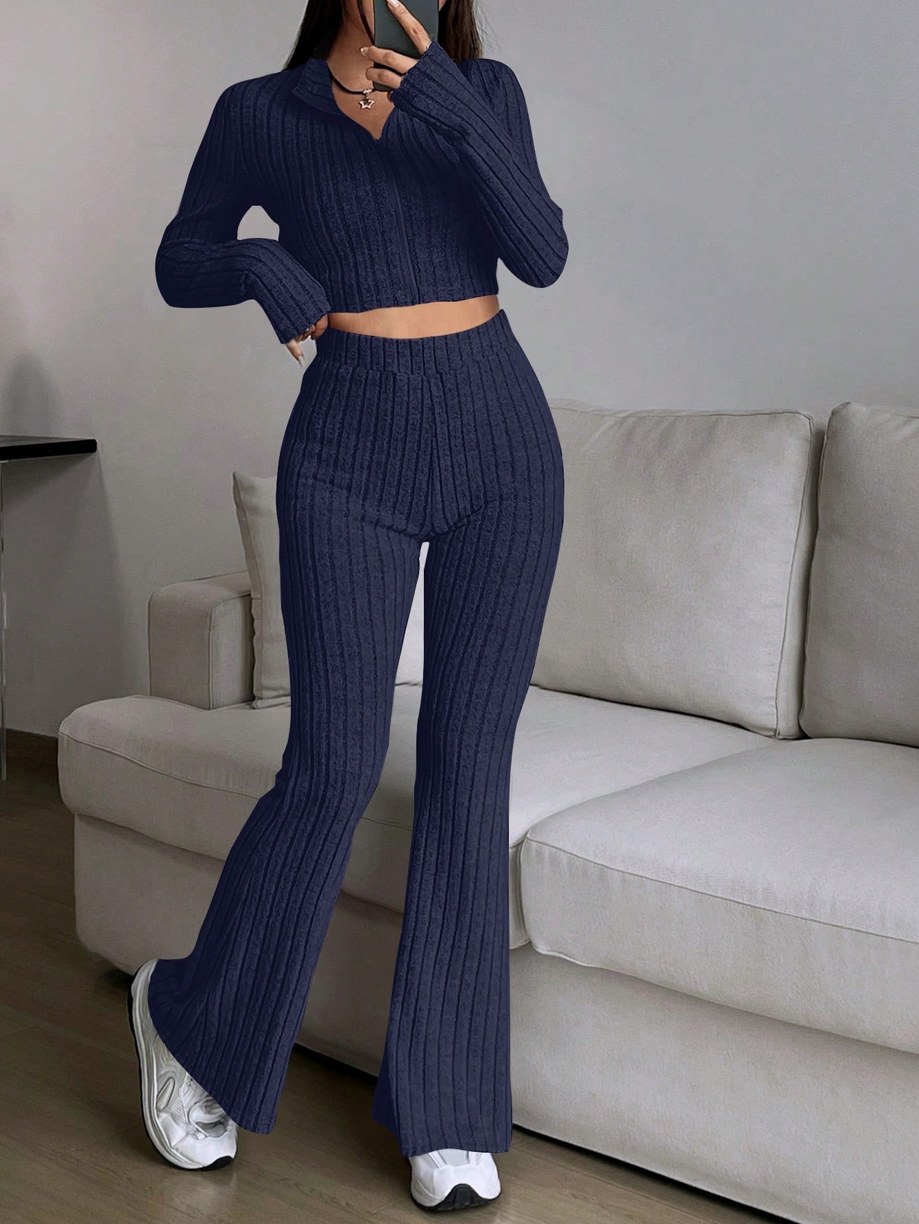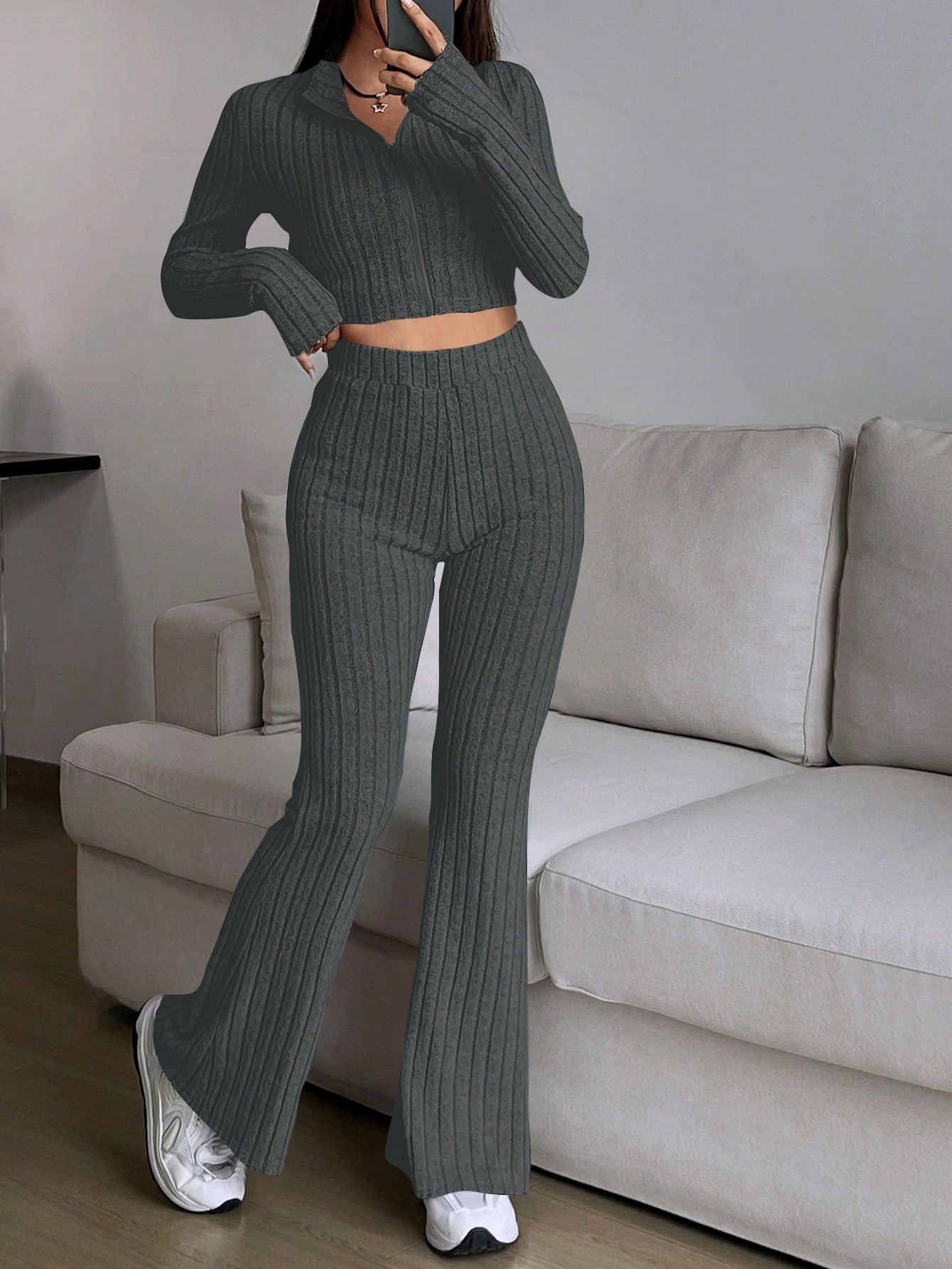 Fashion Solid Ribbed Two-Piece Set, Zip-Up Long Sleeve Cropped Top and High-Waisted Flared Pants Set, Women's Casual