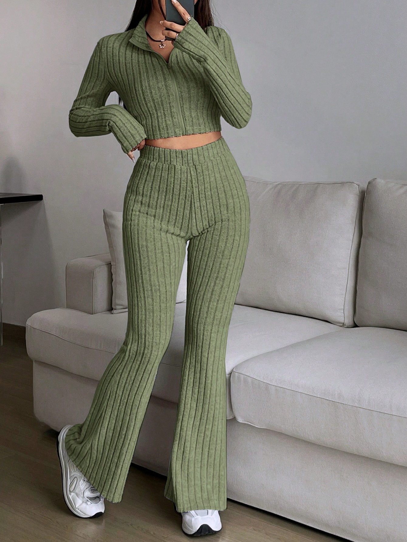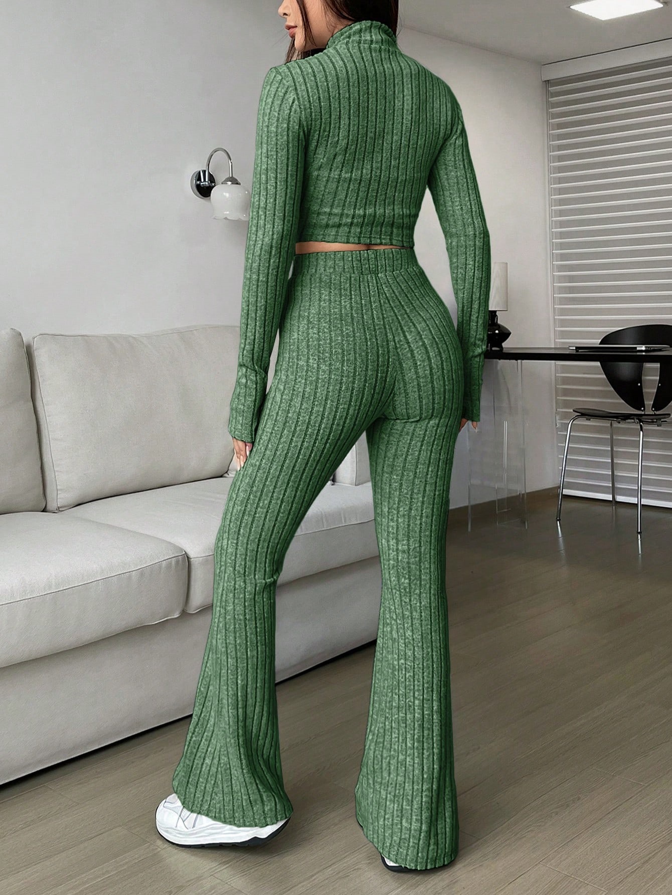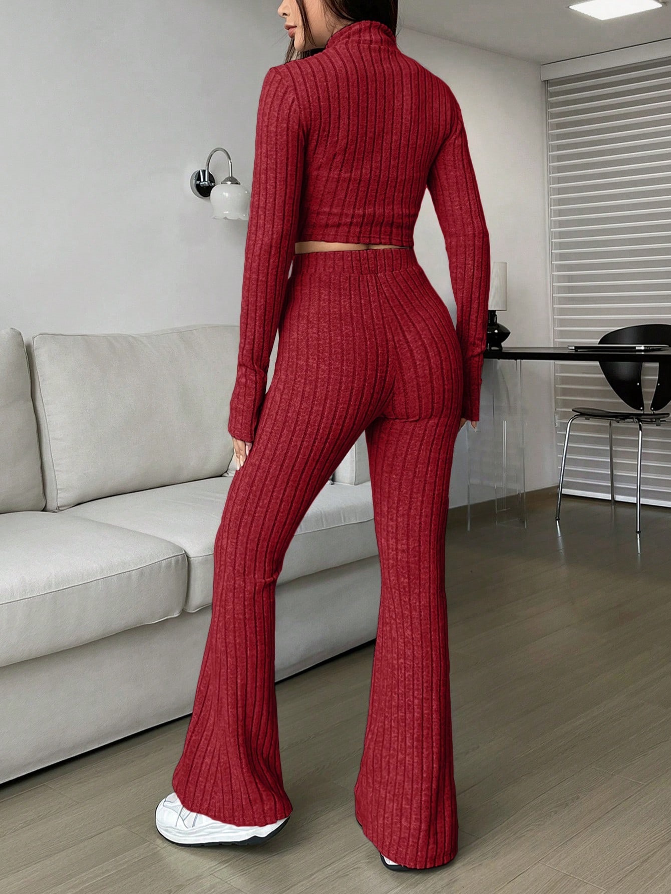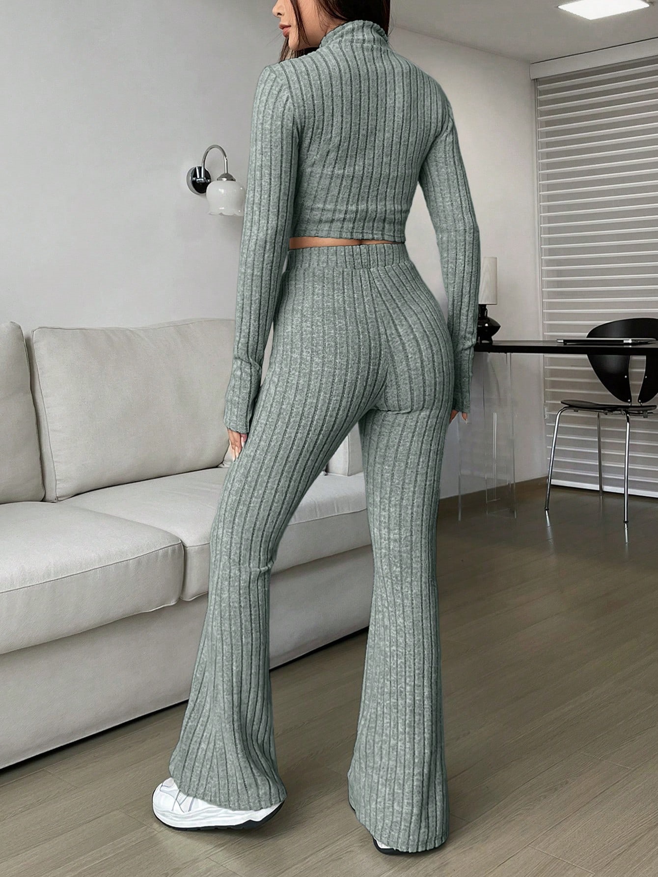 Fashion Solid Ribbed Two-Piece Set, Zip-Up Long Sleeve Cropped Top and High-Waisted Flared Pants Set, Women's Casual