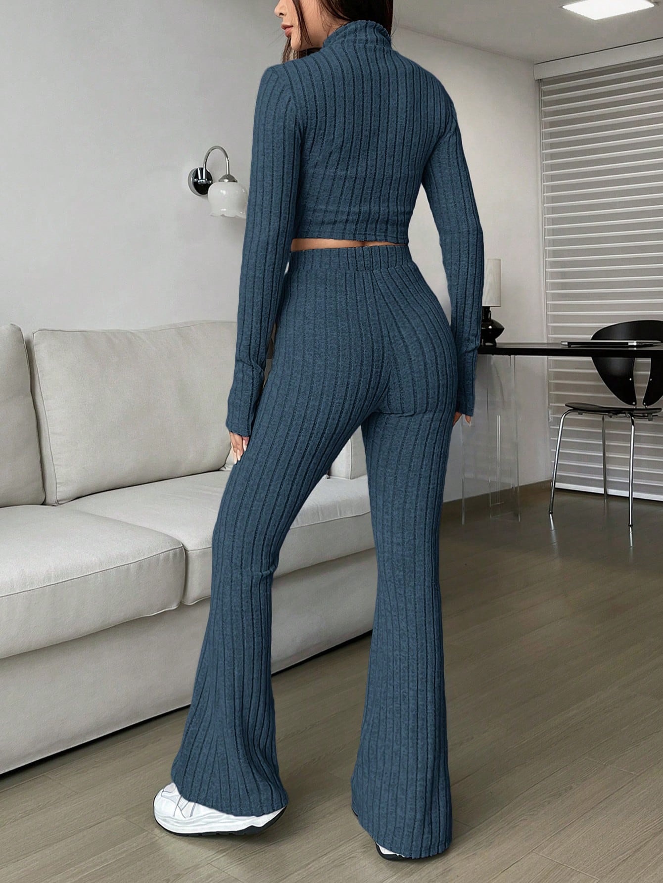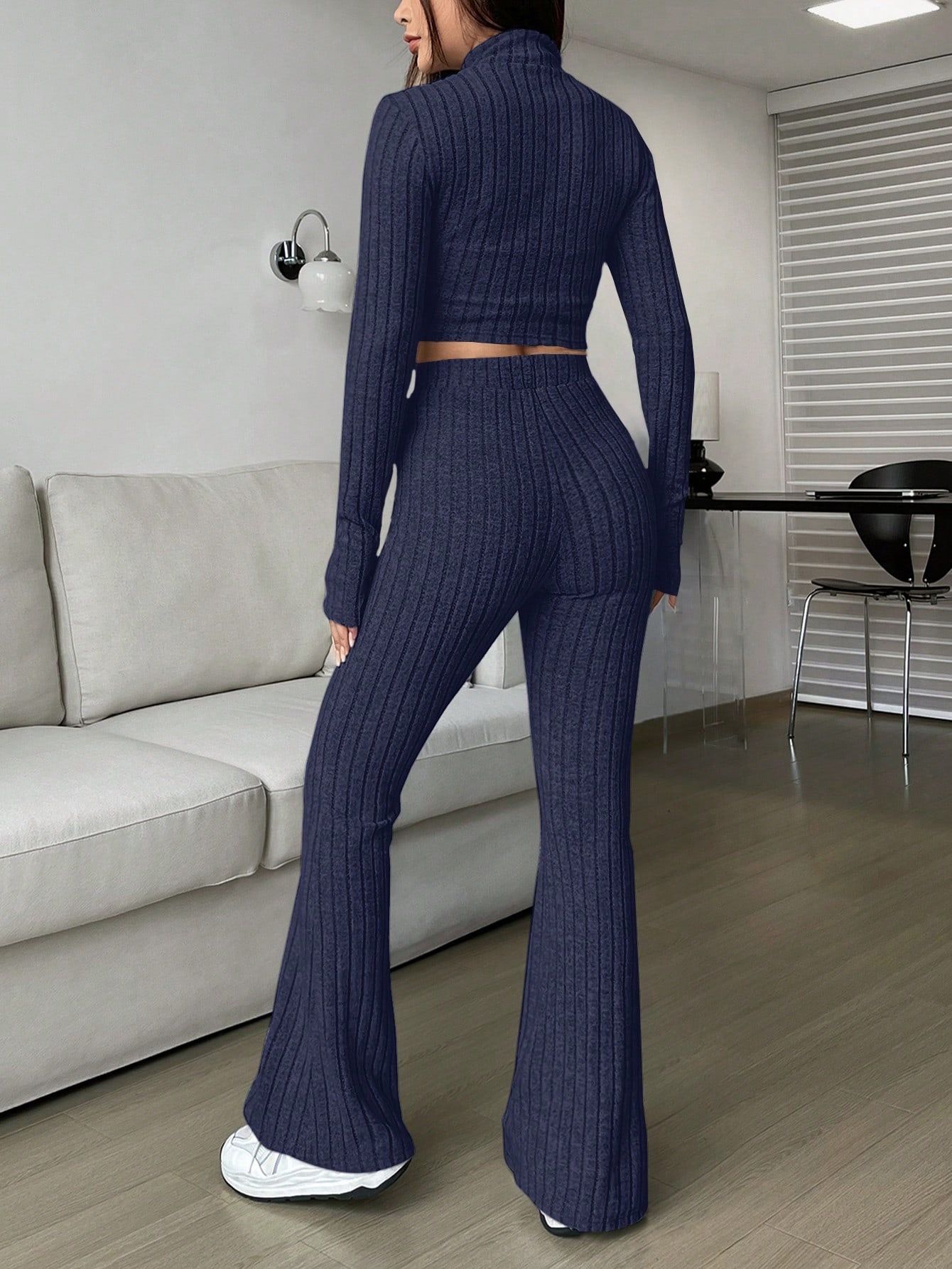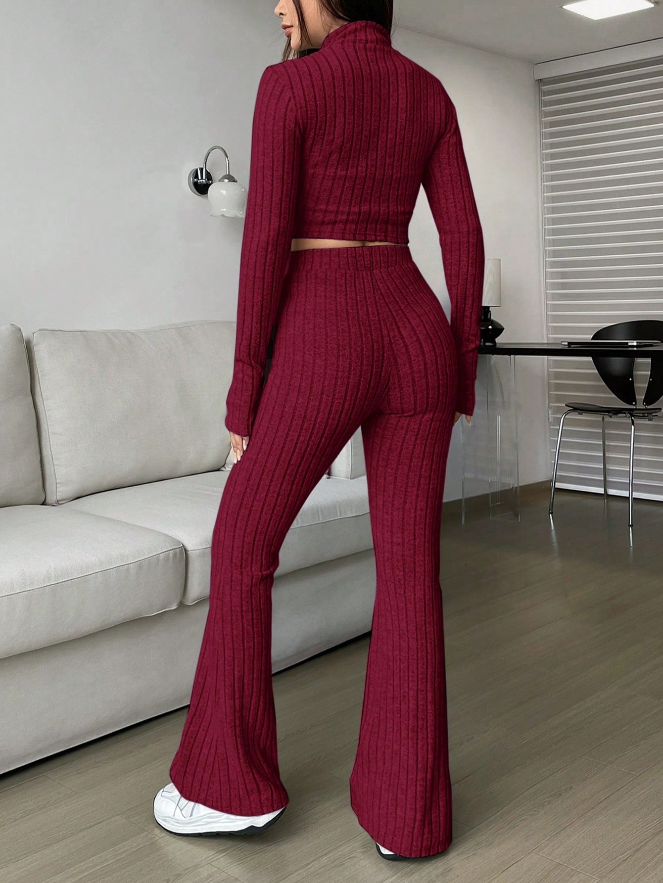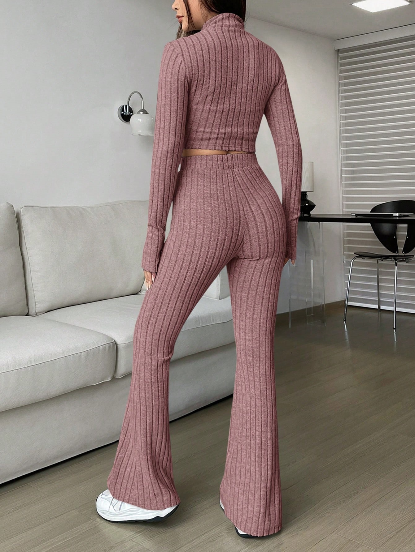 Fashion Solid Ribbed Two-Piece Set, Zip-Up Long Sleeve Cropped Top and High-Waisted Flared Pants Set, Women's Casual
